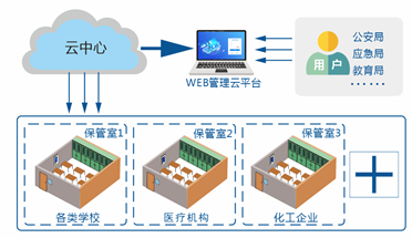 該系統三終端技術裝置通過網絡接入“實驗?;噭┲腔酃芾砭C合應用平臺”聯網運行后,將相關信息實時上報到管理平臺。各類用戶可通過管理平臺對學校實驗?;噭┥曩彙⒋鎯?、收發、使用、廢棄物處置全過程共享應用、實時監管,對異常行為和異常事件聯動處置。