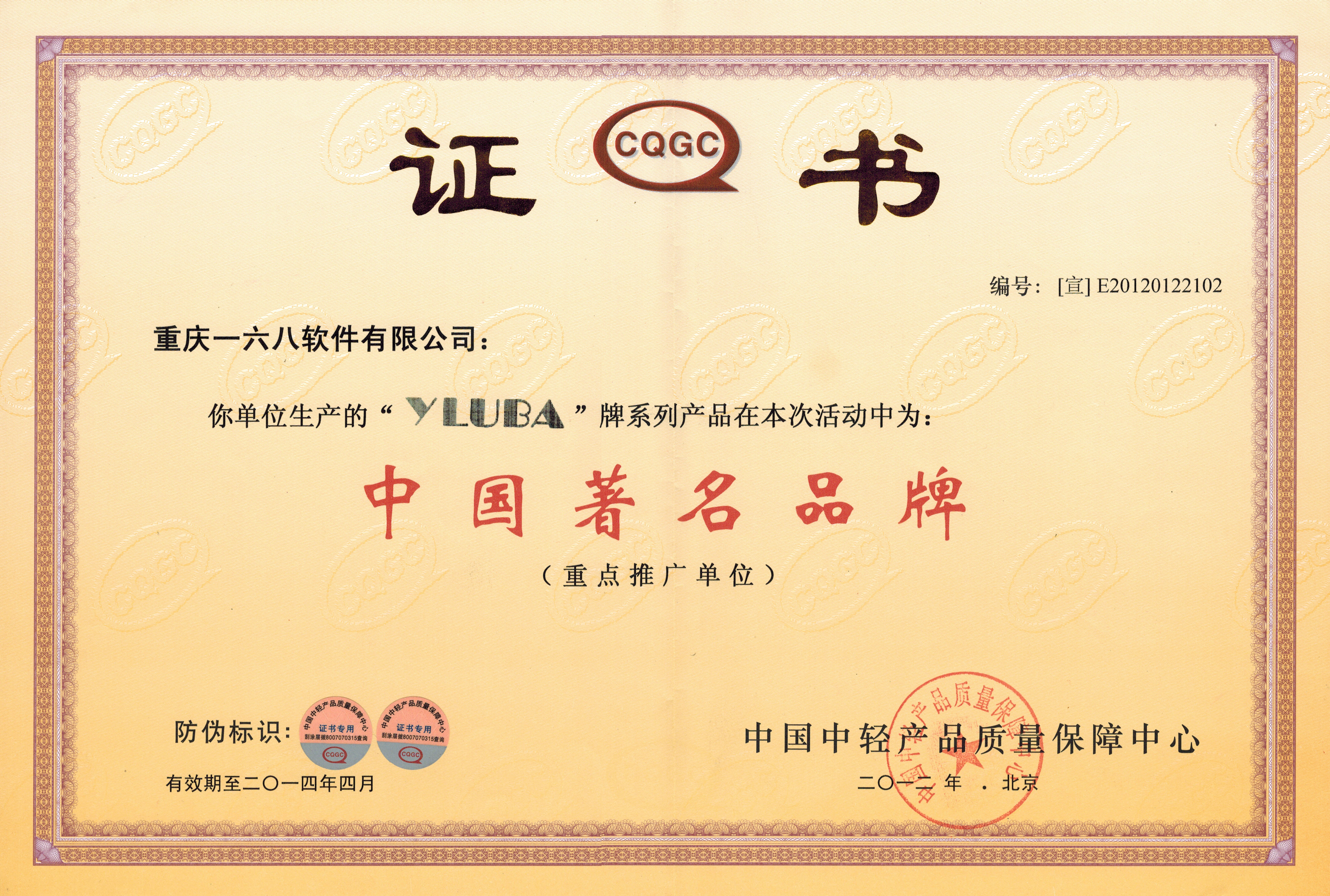 中國著名品牌產品證書